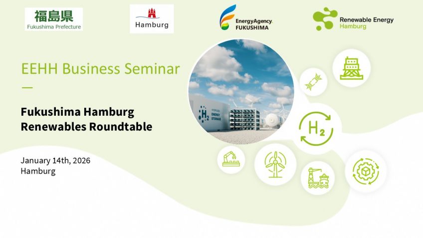 Im Januar 2026 wird das Memorandum of Understanding (MoU) zwischen der Stadt Hamburg und der Präfektur Fukushima erneuert, bei dem ein besonderer Fokus auf wissenschaftliche Zusammenarbeit gelegt wird. Zu diesem Anlass wird eine hochrangige Delegation unter der Leitung des Governeurs Uchibori nach Hamburg reisen. Als Rahmenprogramm organisiert das EEHH-Cluster mit der Unterstützung der Behörde für Wirtschaft, Arbeit und Innovation (BWAI) ein Wirtschaftsseminar, um den Austausch von führenden Unternehmen und Wissenschaftseinrichtung in den Bereichen Wasserstoff und Sektorenkopplung zu fördern.