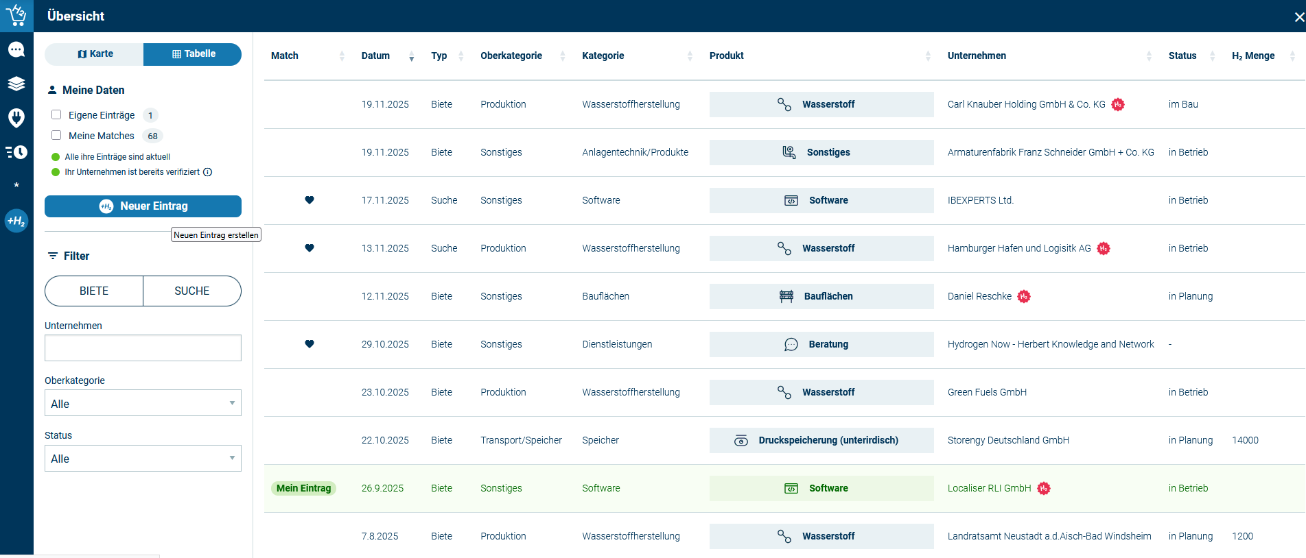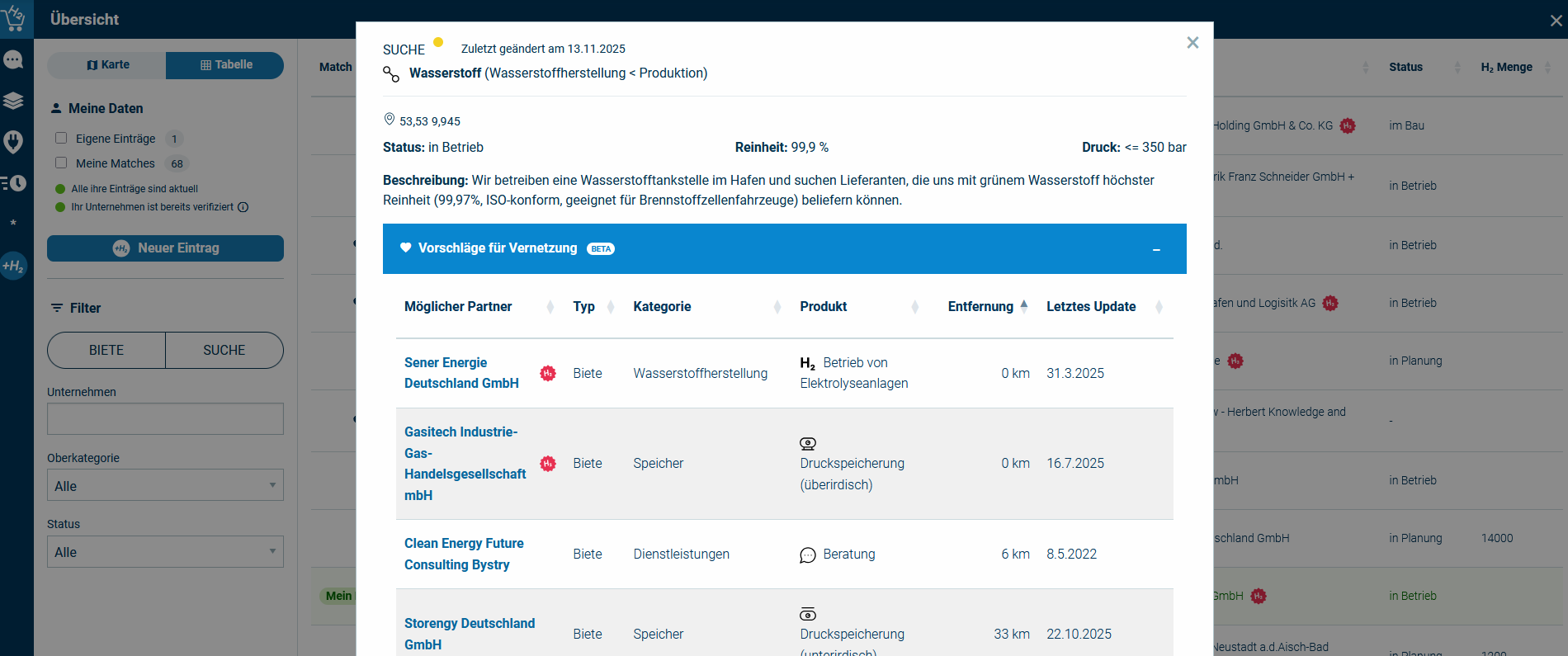 Als Projekt in Berlin-Brandenburg gestartet, bietet das Tool heute bereits deutschlandweit und teilweise sogar international Wasserstofftätigkeiten eine leicht zugängliche Bühne. Der Wasserstoffmarktplatz ermöglicht die datengestützte, georeferenzierte Darstellung von Wasserstoffstandorten in Deutschland und macht auf diese Weise Bedarfe und Erzeugung sichtbar. Über die Wasserstoffproduktion hinaus können ebenfalls andere Aktivitäten, wie beispielsweise der Wasserstofftransport, -speicherung oder die Suche nach Projektpartnern abgebildet werden. Dabei ist die Registrierung für Unternehmen kostenlos und ohne Anforderungen.