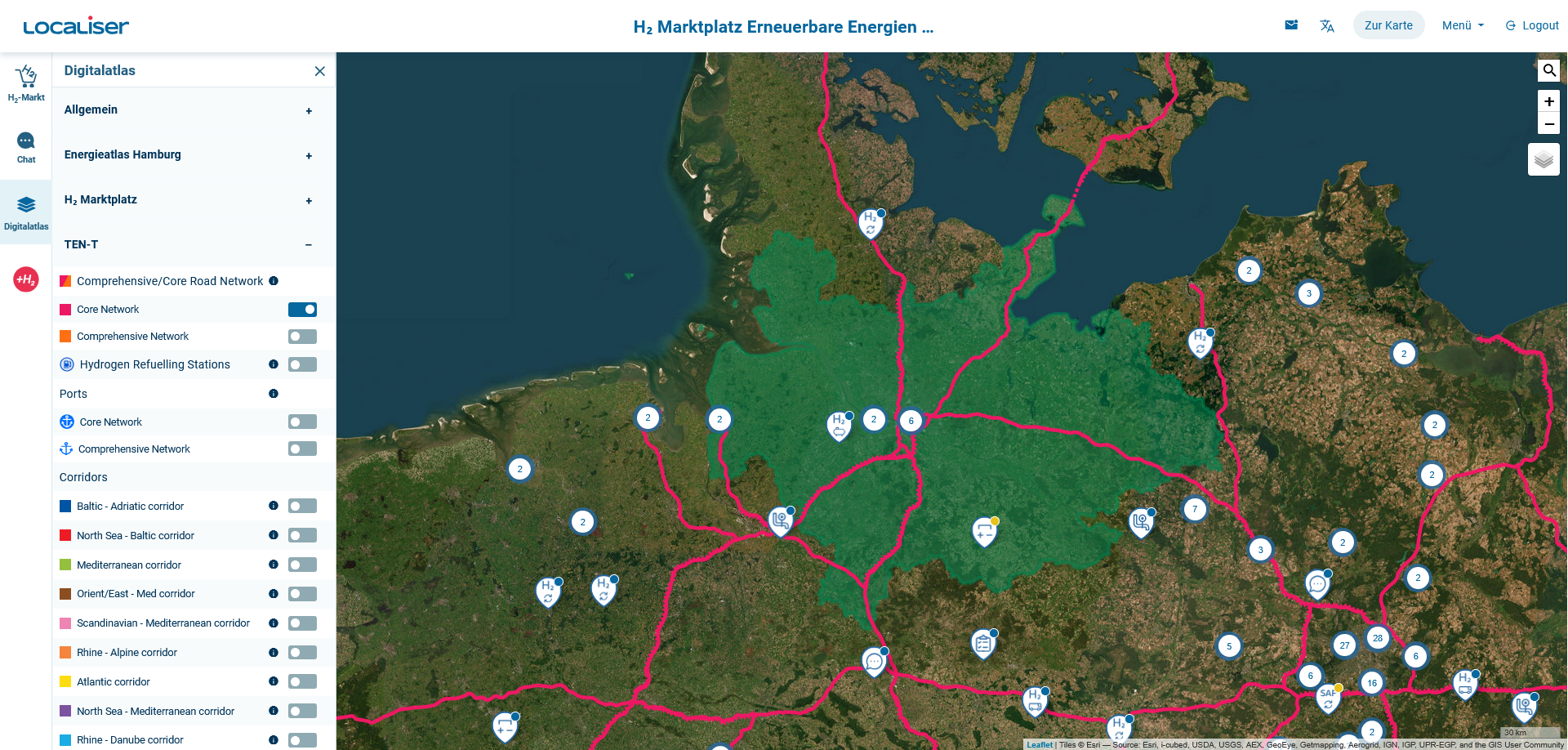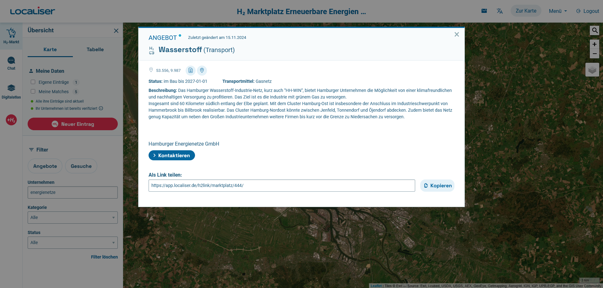 - georeferenzierte Darstellung von Wasserstoffangeboten und -gesuchen entlang der gesamten Wertschöpfungskette