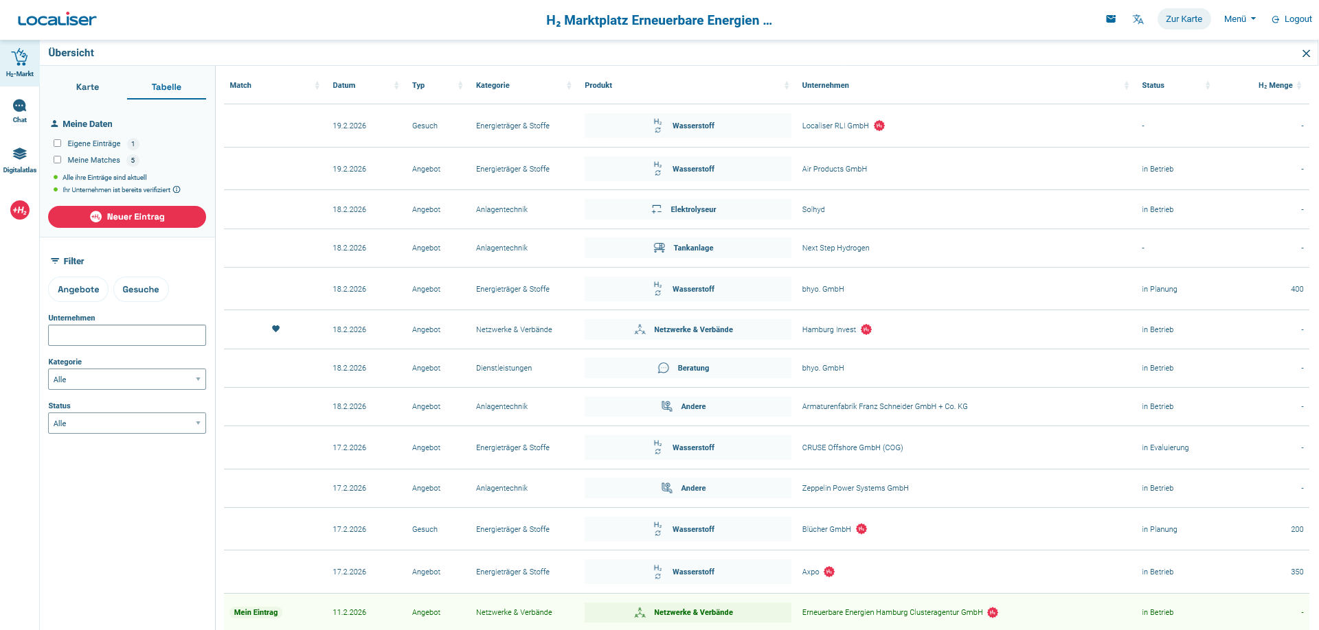 Hierzu bietet das Tool heute bereits deutschlandweit und teilweise sogar international Wasserstofftätigkeiten eine leicht zugängliche Bühne. Der Wasserstoffmarktplatz ermöglicht die datengestützte, georeferenzierte Darstellung von Wasserstoffaktivitäten in Deutschland und macht auf diese Weise Bedarfe und Angebote sichtbar. Über die Wasserstoffproduktion hinaus können ebenfalls andere Aktivitäten, wie beispielsweise der Wasserstofftransport, -speicherung oder die Suche nach Projektpartnern abgebildet werden. Dabei ist die Registrierung für Unternehmen kostenlos und ohne Anforderungen.